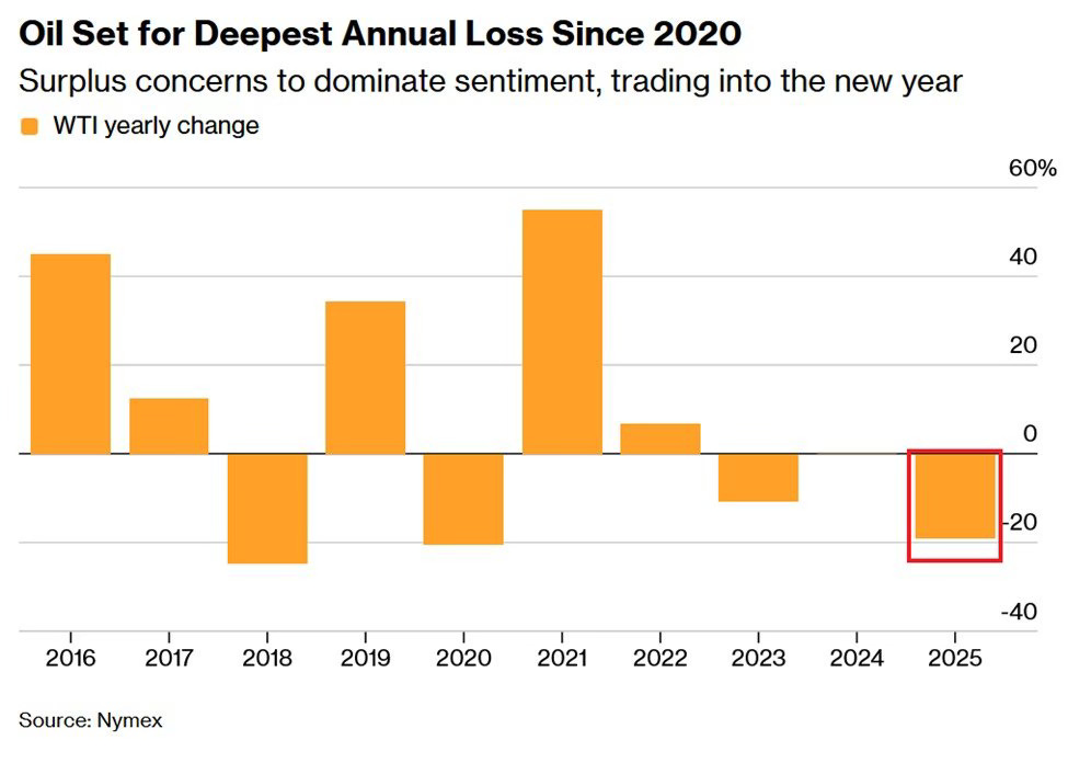 Oil prices just closed one of their toughest years in decades. WTI crude fell roughly 20% in 2025, marking its largest annual decline since the 2020 pandemic.