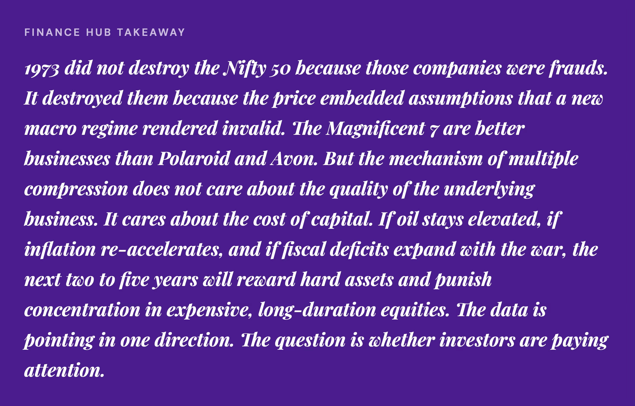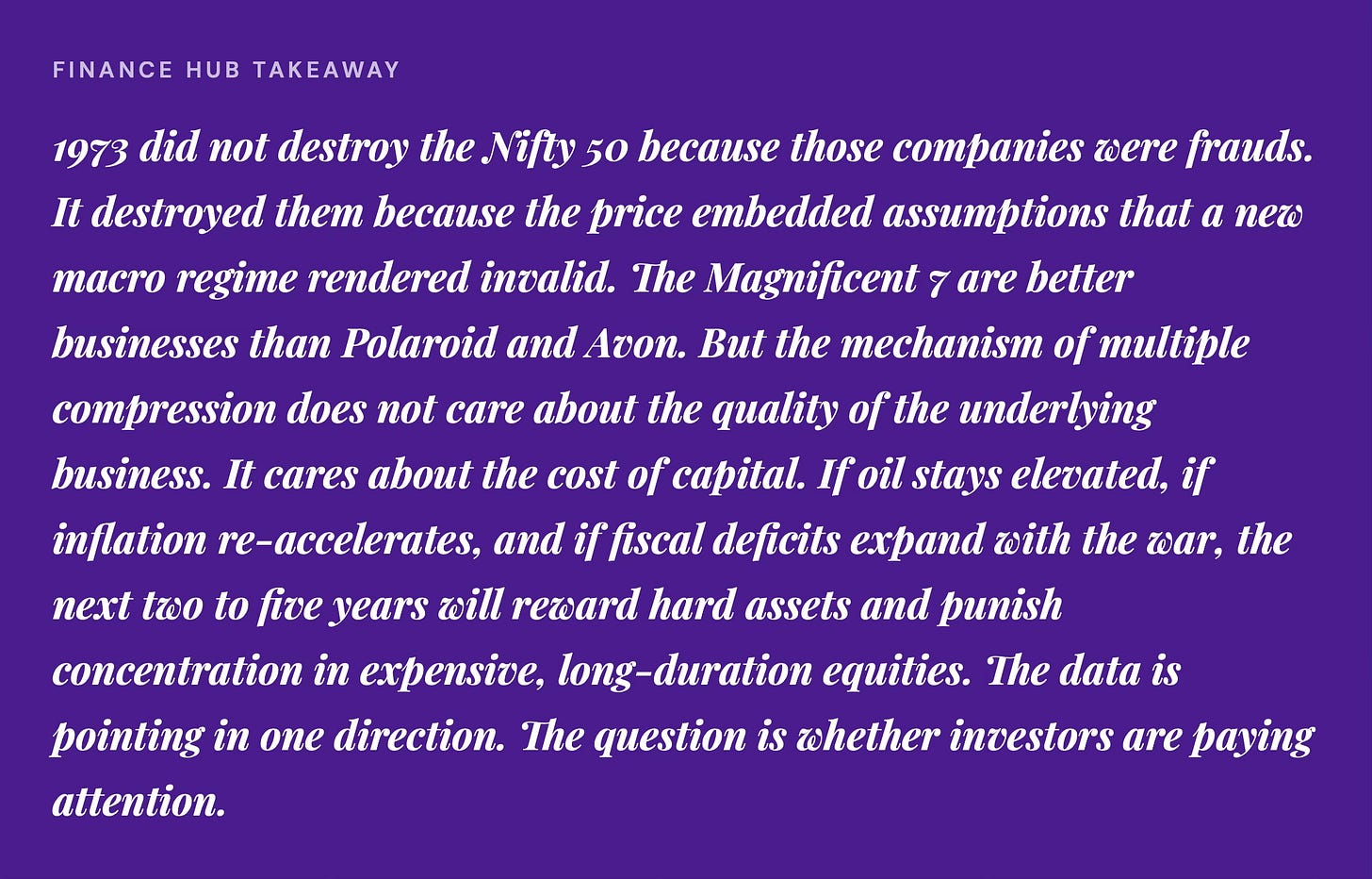 The Nifty 50 investors were not stupid. They owned real companies with real earnings. Their mistake was not the companies they chose. It was the price they paid and the macro environment they ignored. They assumed the good times were durable because the good times had been durable for years. That assumption cost them a decade.