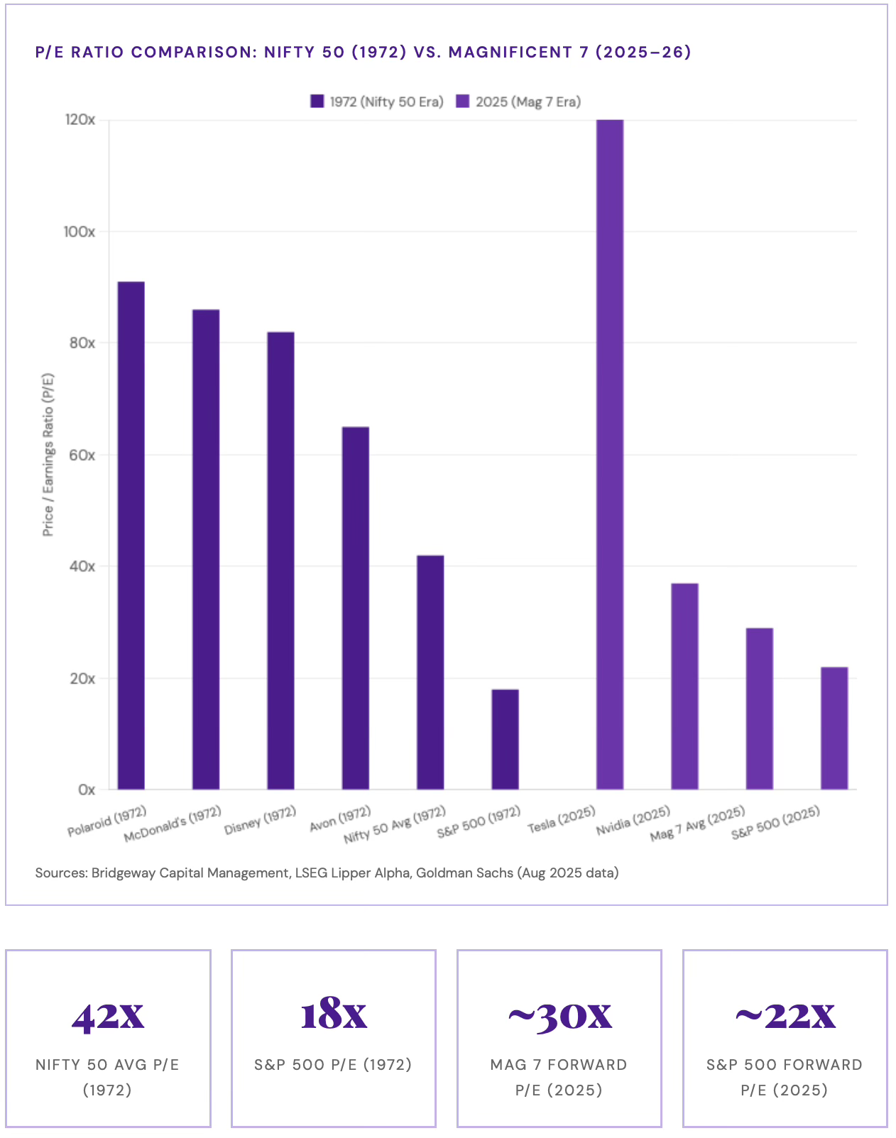The Nifty 50 averaged a price-to-earnings (PE) ratio of 42x at their 1972 peak. Price-to-earnings measures the share price relative to the company's earnings. It can also be looked at as the inverse of the earnings yield implied by the stock. So a P/E of 42x is equivalent to an earnings yield of 2.4% (1 divided by 42). The S&P 500 at the time traded at 18x. Polaroid commanded a P/E of 91. McDonald’s traded at 86x. Walt Disney was at 82x. Avon Products at 65x. The “nifty fifty” were not speculative technology startups. They were tried and true companies like Coca-Cola and Xerox. Real companies with real earnings. But they were priced as if nothing could go wrong for a generation.