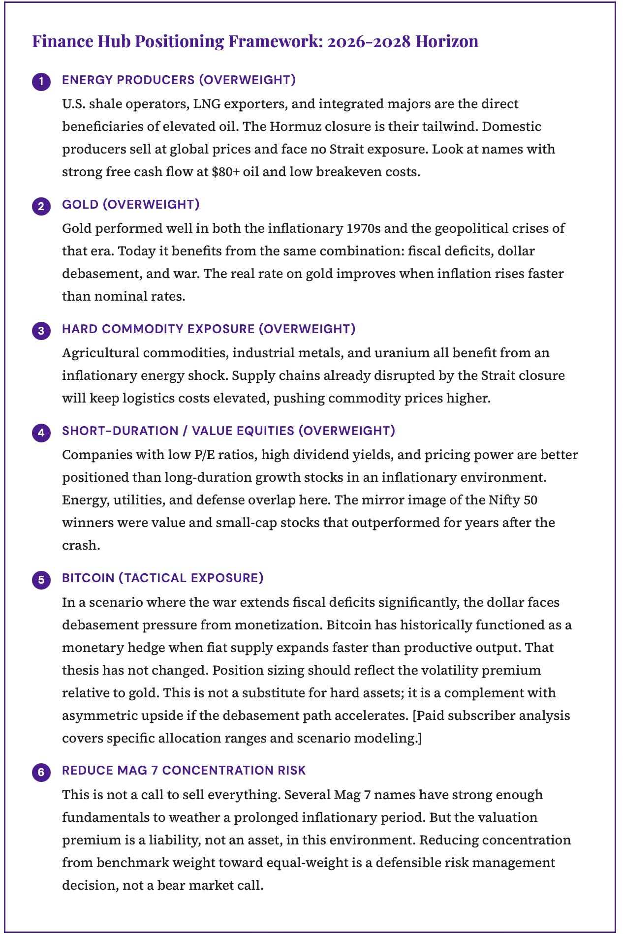 An honest comparison requires acknowledging the differences. The U.S. is now a net energy exporter. Shale production provides substantial domestic supply that did not exist in 1973. The Federal Reserve has better institutional knowledge of stagflation from the Volcker era. The Magnificent 7 have real cash flows, not speculative earnings. And concentrated markets can stay concentrated for longer than fundamental analysis suggests they should because of structural passive flows.