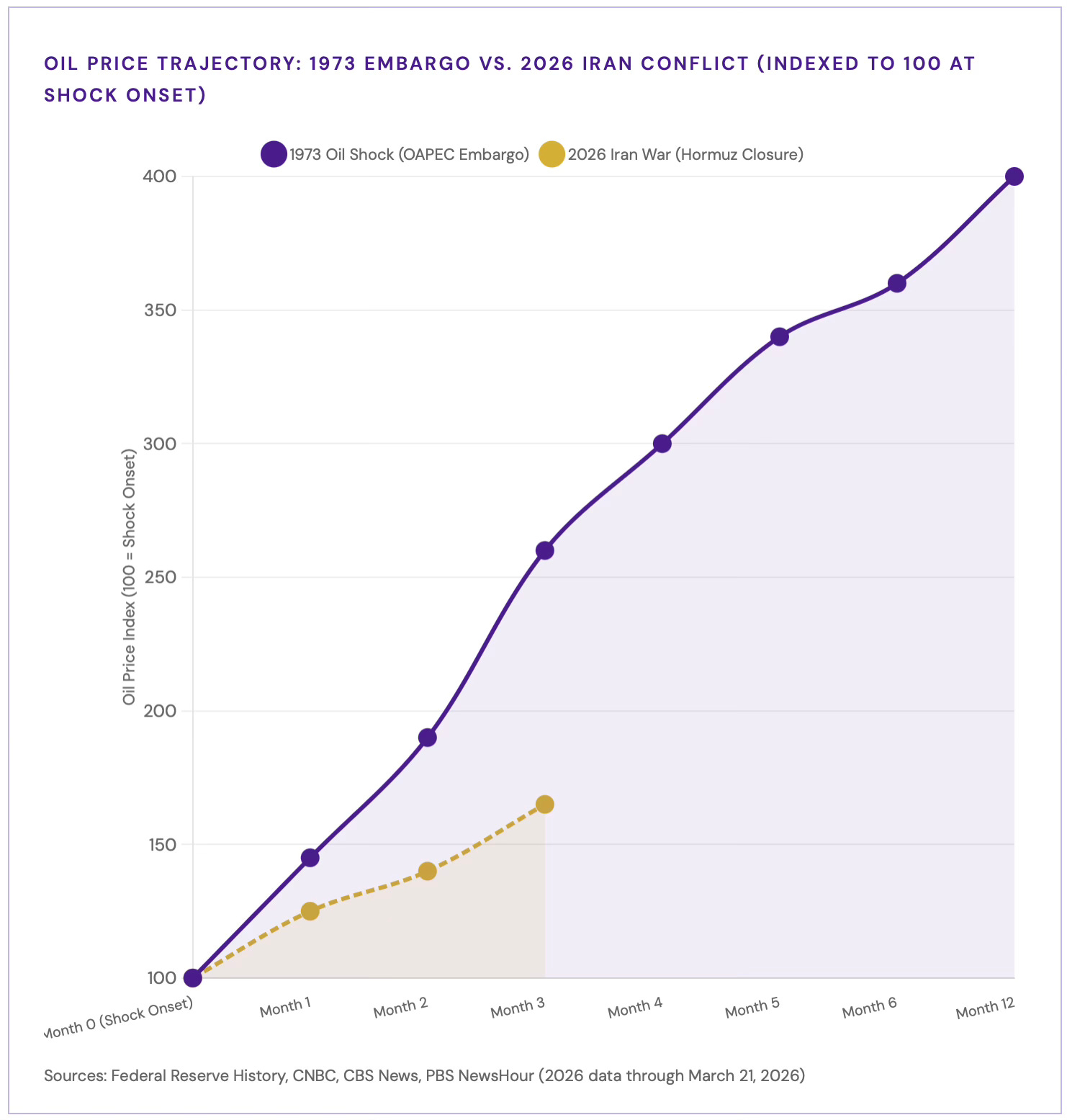 In 1973-74, inflation had been running at 3.5% when the oil embargo began. It reached 11% by 1974. The oil shock alone was responsible for significant inflation, but the underlying fiscal excess meant the Fed had almost no room to act without triggering recession. The same dynamic now presents itself. The Fed was already dealing with inflation stuck above target. Tariffs imposed in 2025 pushed prices modestly higher. An energy shock layered on top of that base creates a genuine stagflation risk, where slowing growth and rising prices force policymakers into an unwinnable trade-off.