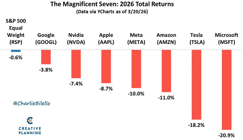 The Magnificent Seven are down approximately 7% year to date, underperforming a broader market that is itself off roughly 5% in 2026. That spread tells you something important: the index is falling, and its largest positions are falling faster. Microsoft is down nearly 21%. Tesla and Amazon have each shed more than 18% & 11% respectively. Every name in the group is in the red. Mag 7 profit growth is now expected to come in at 18% in 2026, the slowest pace since 2022, and only modestly ahead of the 13% projected for the other 493 companies in the S&P 500. That narrowing gap is the entire problem. Investors paid a 29-30x earnings multiple on the assumption that these companies would grow at a structurally different rate than everything else. That assumption is eroding. The companies did not get worse. The math just stopped working in their favor.