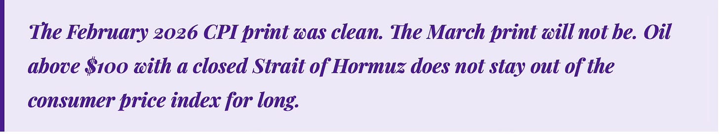 U.S. CPI came in at 2.4% year-over-year in February 2026, the lowest reading since May 2025. The number looks benign on its surface. But it was collected before the full energy shock from the Iran war had propagated into consumer prices. Oil price increases do not hit the CPI immediately. They work through the economy with a lag of weeks to months, showing up first at the gas pump, then in transportation costs, then in food prices and manufactured goods.